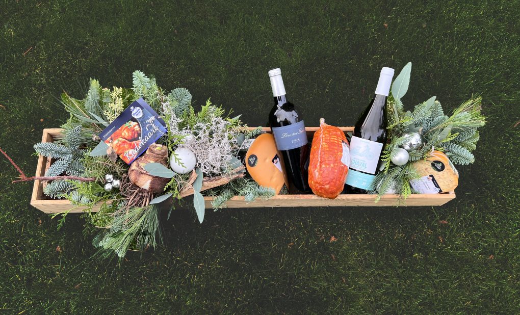 Verras je personeel of relaties met een uniek kerstcadeau op maat! Ik maak een prachtig kerststuk, gecombineerd met heerlijke producten zoals Klaverkaas, vlees van Thaam Dam (rollade of spareribs), biologische wijnen of een cadeaubon naar keuze.